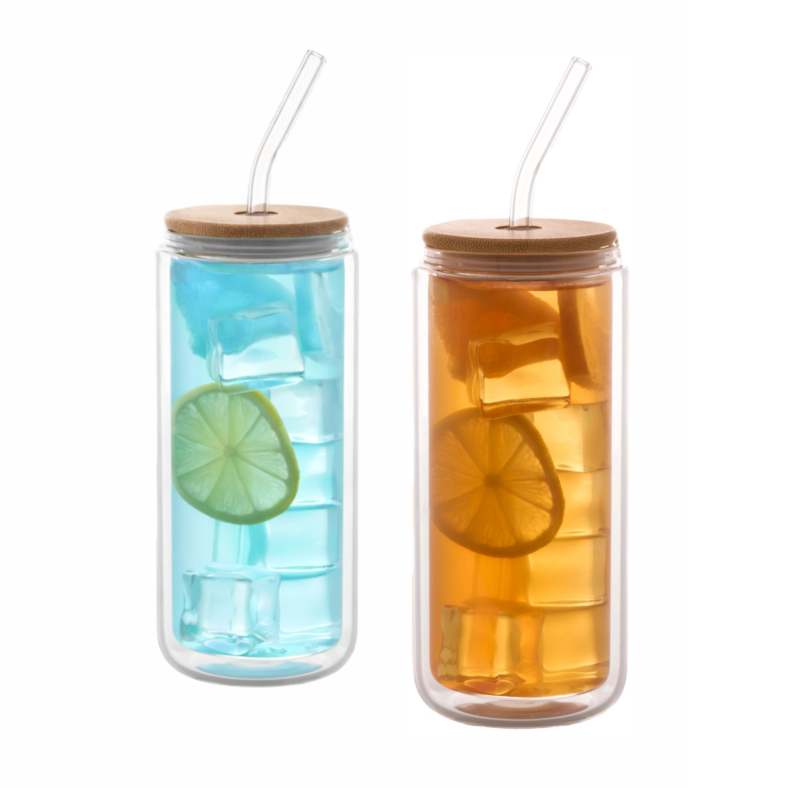 16oz DoubleWall Glass Cups with Bamboo Lids & Glass Straws – Set of 2 Insulated Borosilicate Tumblers – Iced Coffee, Tea, Water, Smoothie – Includes Straw Cleaner